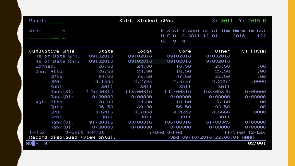 KEY TERMS • GPA – Grade Point Average: a calculated average of the letter grades you have earned – Unweighted (ranging from 0 – all F’s – to 4 – all A’s) – Weighted (extra points for rigor, including honors, dual enrollment, AICE, and AP) – Cumulative • Transcript – A record of your academic accomplishments, including all courses taken in high school, as well as high school courses taken in middle school (e. g. Algebra I, Spanish) – Lists every class you have taken by semester, as well as the grades you earned in each class