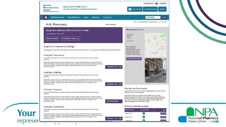 Registered pharmacy premises standards help and resources: NPA • NPA website: https: //www. npa. co. uk/services-andsupport/practical-support/gphc-inspection/ – GPh. C booklet: “Show me, Tell me” – Tips in preparing for an inspections – Sales of medicines protocol • Pharmacy Services team: – Telephone: 01727 891 800 – Email: pharmacyservices@npa. co. uk