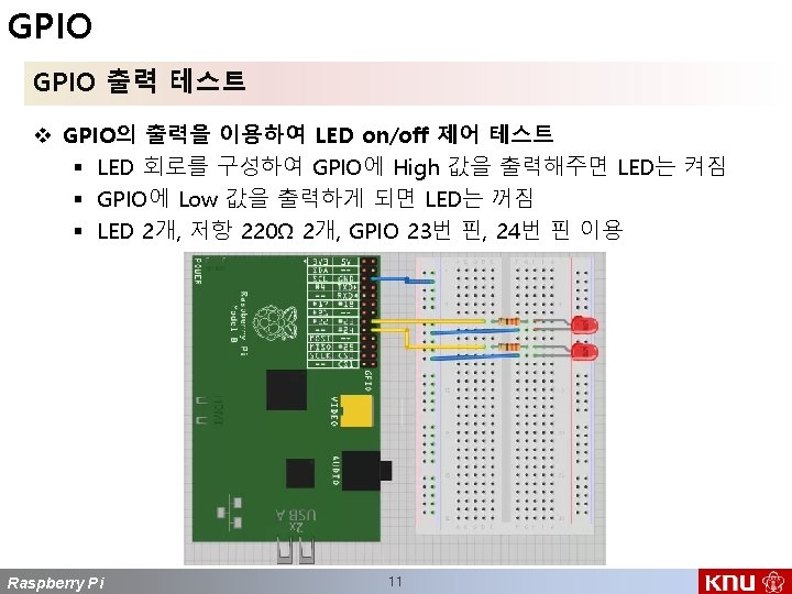 GPIO 출력 테스트 3. 프로그램 빌드 $ sudo gcc –o led. c -lwiring. Pi 4. 프로그램 실행 $ sudo. /led Raspberry Pi 10
