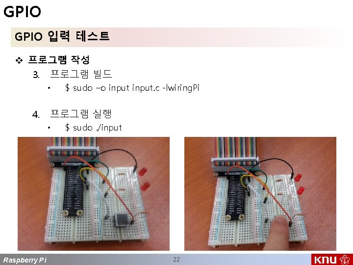 GPIO 입력 테스트 v 프로그램 작성 1. 작업 폴더로 이동 • $ sudo cd ~/gpio pin. Mode(SW, INPUT); 2. 프로그램 작성 • $ sudo nano input. c while(1) { digital. Write(LED 1, 0); digital. Write(LED 2, 0); #include <stdio. h> #include <wiring. Pi. h> #define LED 1 23 //gpio 23 #define LED 2 24 //gpio 24 #define SW 25 //gpio 25 if(digital. Read(SW) == 1) { digital. Write(LED 1, 1); digital. Write(LED 2, 1); delay(1000); } int main(void) { if(wiring. Pi. Setup. Gpio() == -1) return 1; } pin. Mode(LED 1, OUTPUT); pin. Mode(LED 2, OUTPUT); Raspberry Pi 21 } return 0;