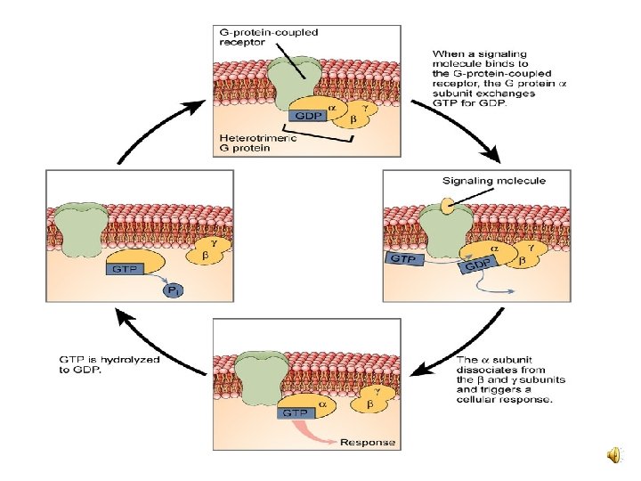 G-protein coupled receptors • When a ligand binds, the receptor changes conformation, allowing G-protein to be activated (GDP is exchanged for GTP) • G-protein dissociates from receptor then subunits from each other. Cell membrane a GTP g b