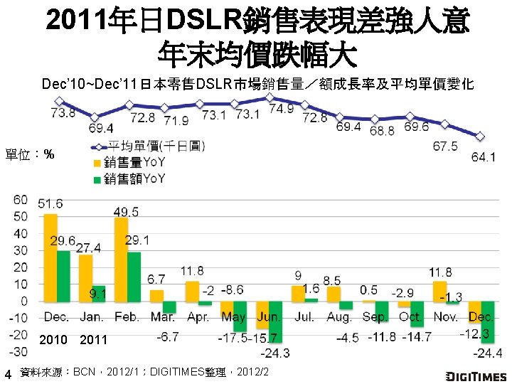 高階機種內外兼具 從消費型DSC市場殺出重圍 2011年 3~12月富士X 100/X 10零售價格變化 單位:千日圓 Olympus XZ-1 Ricoh GR DIGITAL IV Canon Power. Shot S 100 3 資料來源:DIGITIMES,2012/2