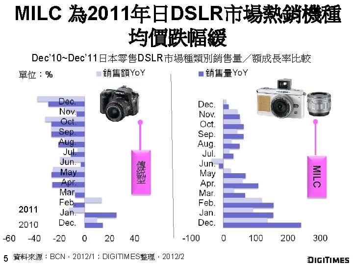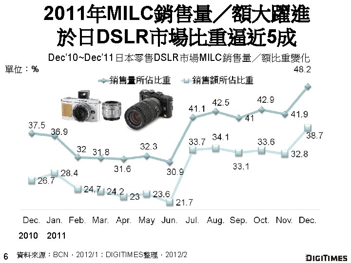 MILC、傳統型各有所好 分佔日DSLR市場前10大暢銷機種 9 排名 品牌業者 機種/型號 有效畫素(萬) 銷售量 所佔比重(%) 1 Nikon D 3100 1, 420 9. 7 2 Canon EOS Kiss X 4 1, 800 8. 3 3 Canon EOS Kiss X 5 1, 800 8. 0 4 Panasonic LUMIX GF 2 1, 210 5. 6 5 Canon EOS 60 D 1, 800 5. 2 6 Sony NEX-5 1, 420 5. 0 7 Nikon D 7000 1, 620 4. 7 8 Olympus OLYMPUS PEN Lite E-PL 2 1, 230 4. 4 9 Nikon D 90 1, 230 4. 1 10 Nikon D 5100 1, 620 4. 0 註:紅字表示為MILC機種。 資料來源:BCN,2012/1;DIGITIMES整理,2012/2