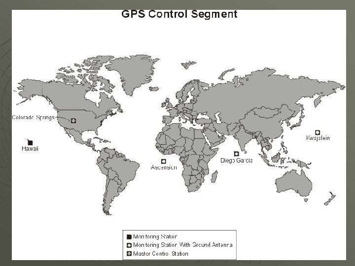 GPS System u u u Space Segment – Satellite Constellation Control Segment– Monitoring Stations and Ground Antennas User Segment – Receivers