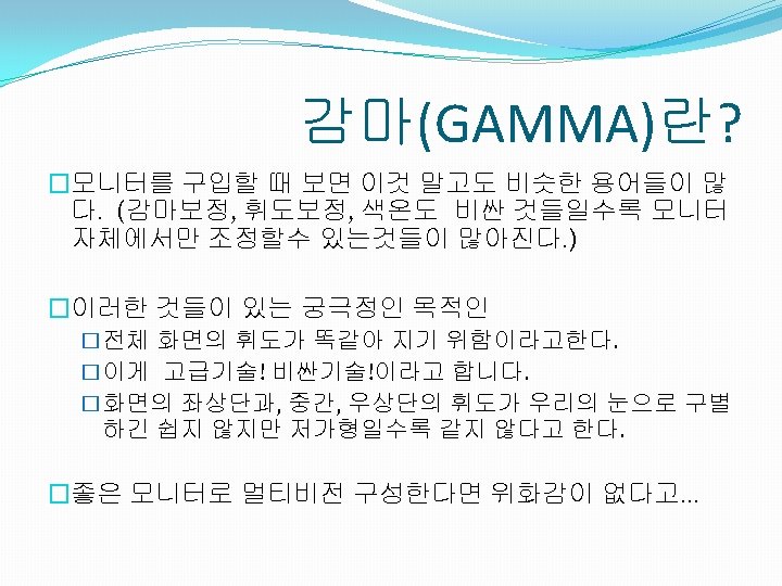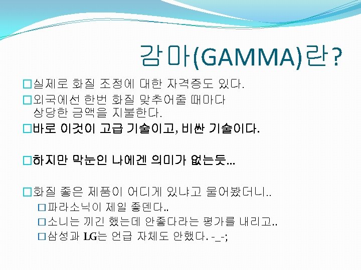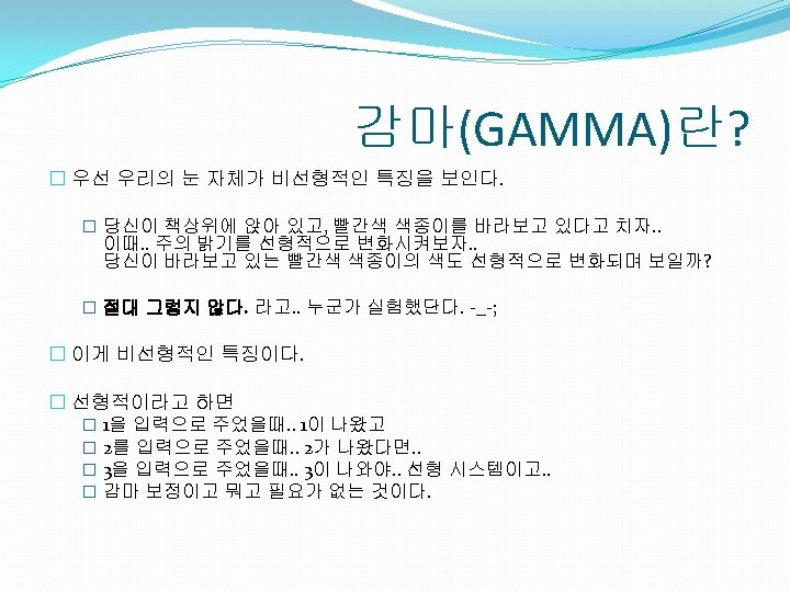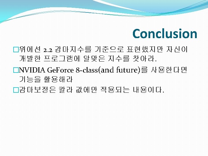 참고자료 �http: //en. wikipedia. org/wiki/Gamma_correction �http: //jufoot. egloos. com/1960058 �http: //cagetu. egloos. com/5148378 �http: //www 1. devpia. com/Maeul/Contents/Detail. aspx ? Board. ID=51&MAEULNO=20&no=8350&page=1
