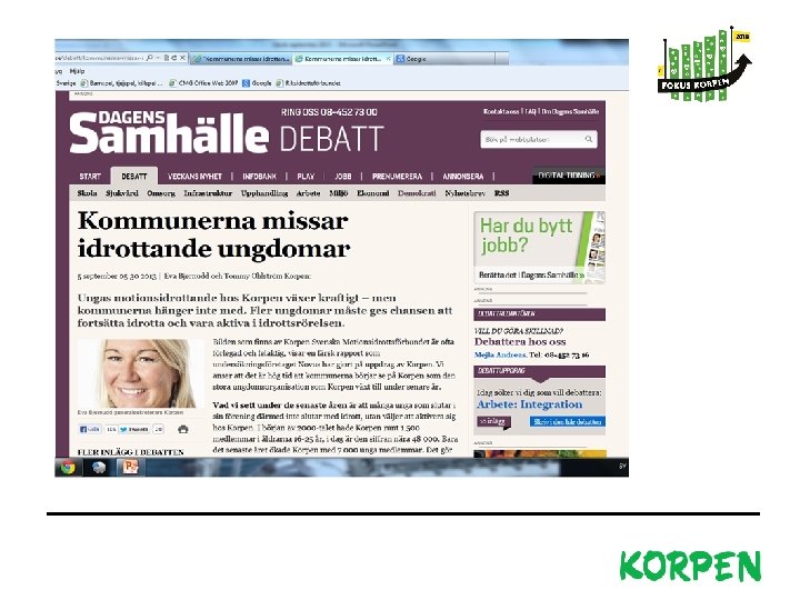 Unga inom Korpen i åldern 16 -25 Från enstaka ungdomskampanjer på 70 -90 -talet till medveten satsning via Idrottslyftet på 2000 -talet. 2001: 2006: 2014: Ca 1500 Ca 32 000 Ca 50 000 Apropå Korpens framgång: ”Dessa lyckosamma satsningar haft sin grund i en medveten satsning på ungdomar som dels slutat idrotta i traditionella idrottsföreningar, dels sådana som inte tidigare varit idrottsaktiva” Rapport av Eriksson/Patriksson/Stråhlman, Idrottshögskolan, Göteborgs universitet, 2011