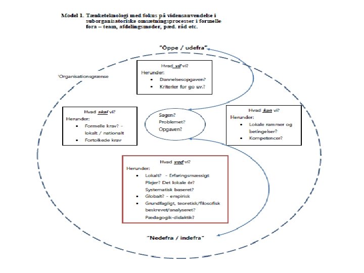 Problemstilling – Hvilke organisatoriske praksisformer – mødeformer og indhold, ’dagsordener’, processer etc. – kan sikre og fremme, at det pædagogiske personales vidensmæssige grundfagligheder kommer i spil og bliver centrale mødet i med eksterne krav og udformningenaf ændret og evt. ny pædagogisk-didaktiskpraksis?