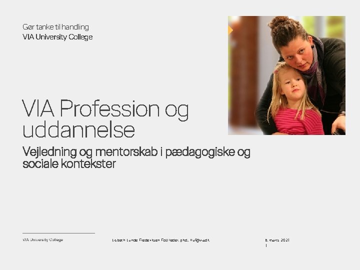 Gør tanke til handling VIA University College VIA Profession og uddannelse Vejledning og mentorskab i pædagogiske og sociale kontekster Lisbeth Lunde Frederiksen Fo. U leder, ph. d. . lluf@via. dk 6. marts 2021 1