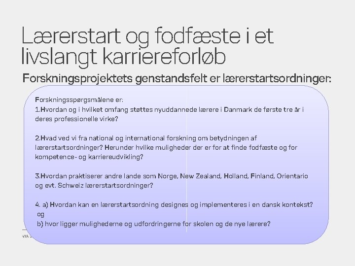 Lærerstart og fodfæste i et livslangt karriereforløb Forskningsprojektets genstandsfelt er lærerstartsordninger: Forskningsspørgsmålene er: 1. Hvordan og i hvilket omfang støttes nyuddannede lærere i Danmark de første tre år i deres professionelle virke? 2. Hvad ved vi fra national og international forskning om betydningen af lærerstartsordninger? Herunder hvilke muligheder er for at finde fodfæste og for kompetence- og karriereudvikling? 3. Hvordan praktiserer andre lande som Norge, New Zealand, Holland, Finland, Orientario og evt. Schweiz lærerstartsordninger? 4. a) Hvordan kan en lærerstartsordning designes og implementeres i en dansk kontekst? og b) hvor ligger mulighederne og udfordringerne for skolen og de nye lærere? 6. marts 2021 6