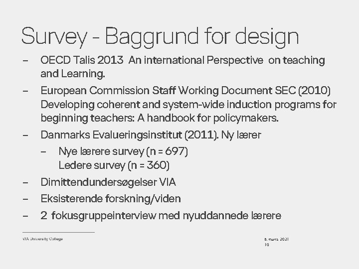 Survey - Baggrund for design – – – OECD Talis 2013 An international Perspective on teaching and Learning. European Commission Staff Working Document SEC (2010) Developing coherent and system-wide induction programs for beginning teachers: A handbook for policymakers. Danmarks Evalueringsinstitut (2011). Ny lærer – Nye lærere survey (n = 697) Ledere survey (n = 360) Dimittendundersøgelser VIA Eksisterende forskning/viden 2 fokusgruppeinterview med nyuddannede lærere 6. marts 2021 10