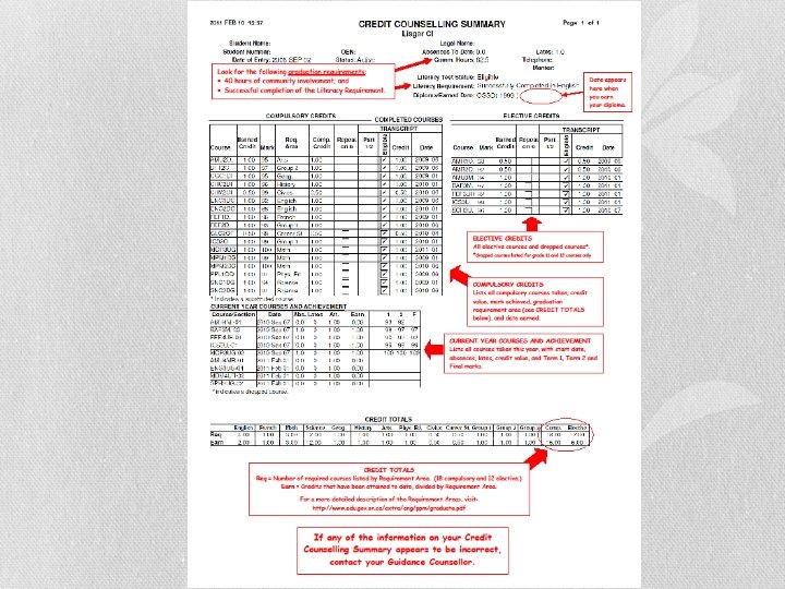 Credit Counselling Summary vs. Transcript • The Credit Counselling Summary lists the credits and marks you have earned. It also shows how many credits you still need to graduate, how many community service hours you have completed and submitted and if you have successfully completed the Ontario Literacy Test. • The Ontario Student Transcript is an official document which shows all credits successfully earned in grades 9 and 10, plus all courses continued past the full-disclosure date (which is 5 days after the mid-term report card goes home), each semester in grades 11 and 12.