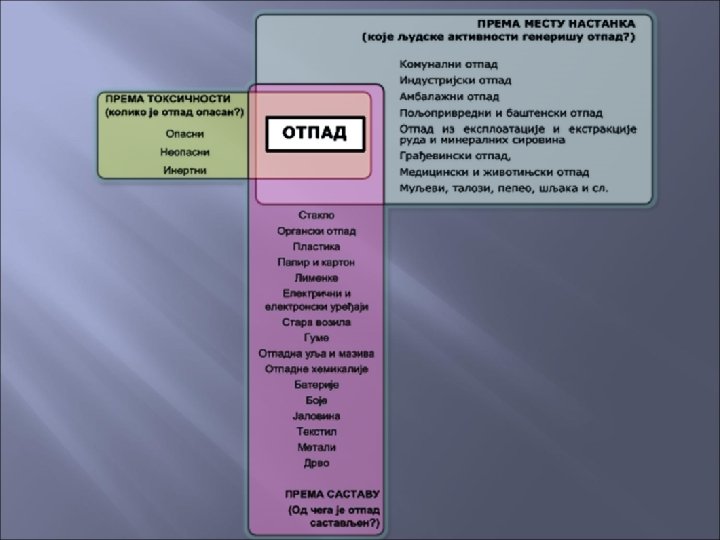 Podela otpada Karakterizacija otpada: - postupak ispitivanja kojim se utvrđuju fizičke, hemijske i biološke osobine i sastav otpada; - da li sadrži jednu ili više opasnih karakteristika (zapaljiv, nadražujući, toksičan, kancerogen, infektivan, mutagen, . . . )