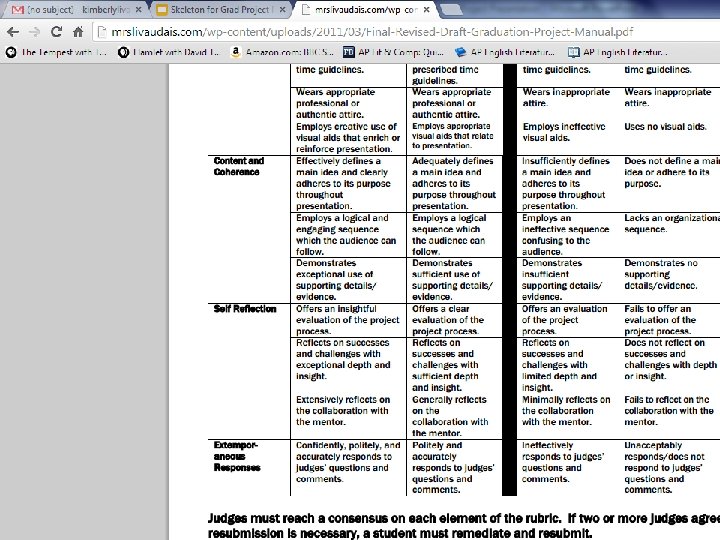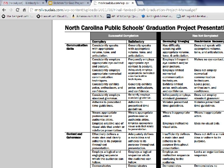 Product Steps Show Steps, Obstacles, and Successes page. Walk judges through the steps, obstacles, and successes. Discuss the pictures and what they represent. Mentor – show picture and talk briefly about how the mentor was helpful Learning stretch – discuss what you learned from the Grad Project as a whole – paper to presentation • • •