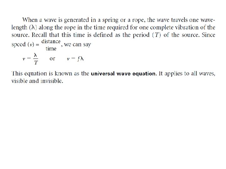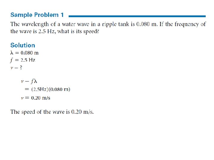 Speed of a wave • The speed of a wave depends on the physical properties of the medium • Examples: – Waves travel faster through stiffer springs – Speed of waves in water depends on the depth – Sound waves travel faster in warmer air