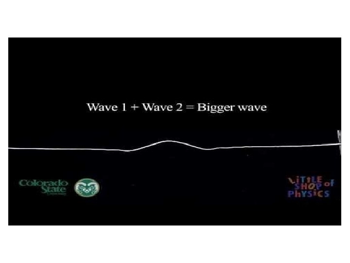 Interference • What happens when two waves meet? • Wave interference occurs when two waves act simultaneously on the same particles of a medium. There are two types of interference: constructive and destructive. • destructive interference occurs when a crest meets a trough resulting in a lower amplitude • Constructive interference occurs when pulses build each other up, resulting in a larger amplitude (crest meets a crest or trough meets a trough)
