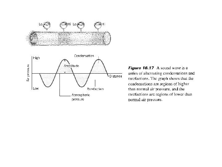 The Nature of Sound • Longitudinal wave that is created by a vibrating object • Sound wave consists of traveling pulses of high pressure zones, or condensations, alternating with travelling pulses of low pressure zones, or rarefactions • These pressure fluctuations are normally very small