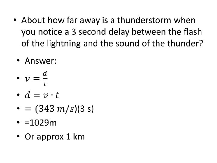 The Speed of Sound • Sound travels through gases, liquids, and solids, at considerably different speeds • At room temp in air its approx 343 m/s • Moves 4 times faster in water • Moves 17 times faster in solids • Speed increases with temp – Air (0°C) 331 m/s – Air (20°C) 343 m/s