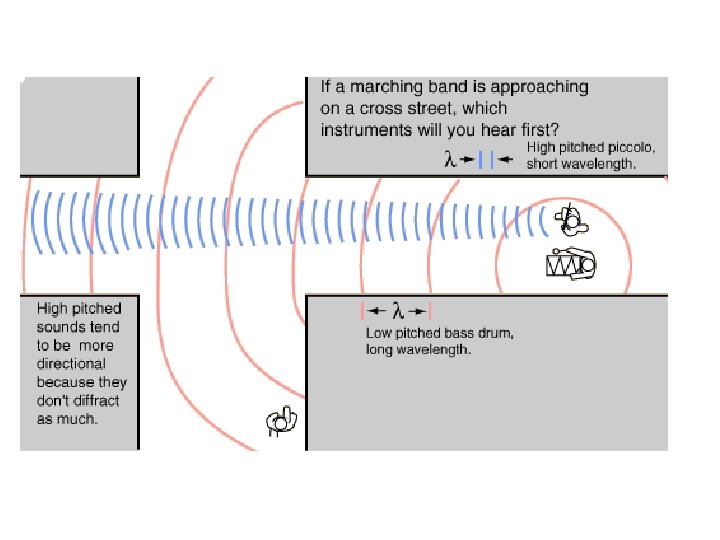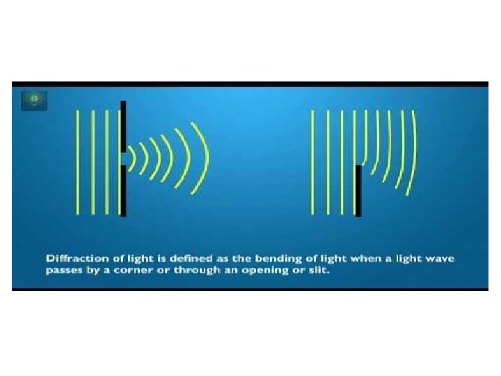 Diffraction • the bending of waves around obstacles and the spreading out of waves beyond openings. • Most pronounced when the wavelength is comparable to the size of the opening or obstacle