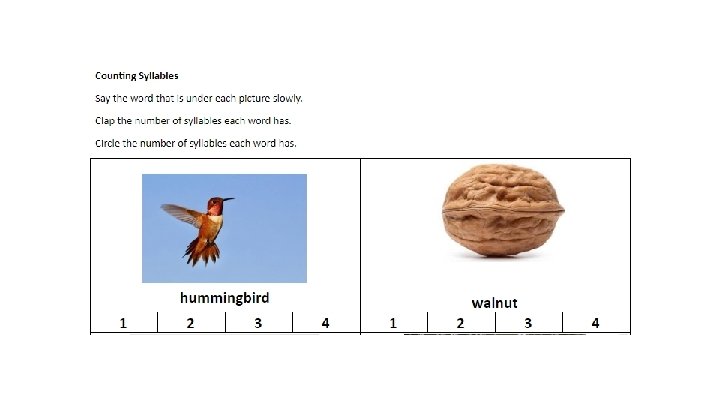 I can: ● Notice details within a picture to build background knowledge. ● Listen to the text read by the teacher. ● Follow along as the teacher rereads and explains the text. ● Watch video to enjoy and build background knowledge. ● Complete Word Work Activities--Counting Syllables ● Complete Fluent Writing Review