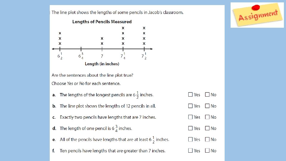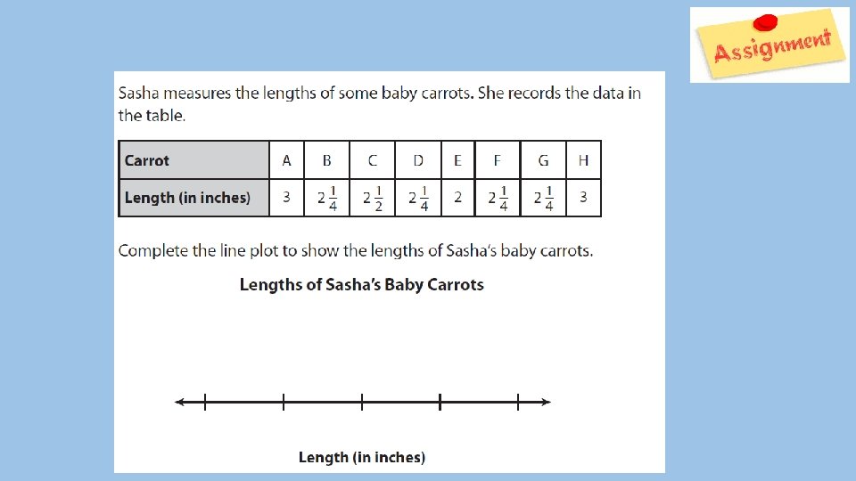 Hello! In today’s lesson you will review organizing data on a line plot using correct units. This lesson consists of an opening, a problem of the day, a math activity, a reflection, and Dreambox if internet is available. All assignments that have this picture are due to your teacher. 2