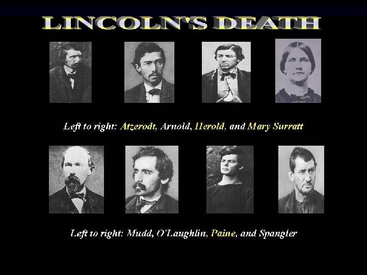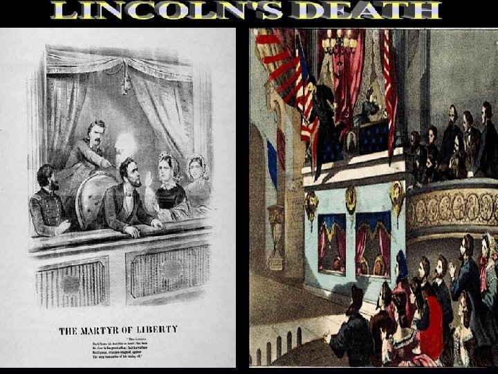 Lincoln’s death • Vendors sold lemonade and cakes, creating a party atmosphere. • At about 1: 26 p. m. the executioner clapped his hands together three times dropping the bodies some 5 to 6 feet. • As each reached the end of the rope, the body jerked upward, then settled into a slow swaying motion. • The bodies hung for nearly 25 minutes, at which time they were cut down and doctors examined them pronounced each one dead. • The bodies were then placed inside the coffins, the lids were closed, and the four were buried in shallow graves near the gallows which had taken their lives.