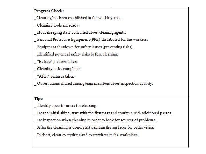 Progress Check: _ Clear team within the workplace boundaries. _Final approval authority for the red tag criteria identified (e. g. item can/cannot be red tagged). _ Sorting criteria set (e. g. , frequency of use; actual quantity needed-no buffer). _ Time set for Sorting phase is clearly defined (e. g. , one hour). _ Red floor marking tape or similar boundary for the local red tag area. _ Red tags and red tag log form exist and available. _“Before” pictures are taken. _ The unnecessary items are identified and red tagged. _ The red tagged items moved to its location (red tag area). _ Red tag log for is updated. _ Plans put in place for the items to be moved to the central red tagging area. _ “After” pictures are taken. Tips to follow: _ Make communication to make sure that the management and employees in the target area are notified when the red tagging will happen. _ Remove all the things that are not used at least weekly. _ Eliminate waste by minimizing the following: _ Inventory : raw material, Recycled material , finished bags. _ Equipment: machine : stools, vehicles, etc. _ Space: core work area floor, storage areas, bins, shelving, etc. _ Not to remove anything before having the local work group's approval.