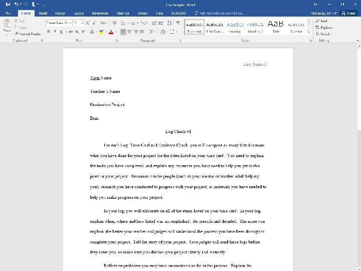 Project Logs • Typed (Times New Roman, 12 pt. font), double spaced • Compose at least 500 words in the reflective entry • Content: o Comment on resources used (materials, people, print/online sources) o Elaborate or explain tasks listed on time card o Reflect on problems, solutions, and successes o Reflect on the tasks accomplished and tasks ahead o Project what needs to happen next and when it will happen • Turn in a time card and one reflective entry at each log check • Obtain mentor’s signature and written comments on EACH log entry