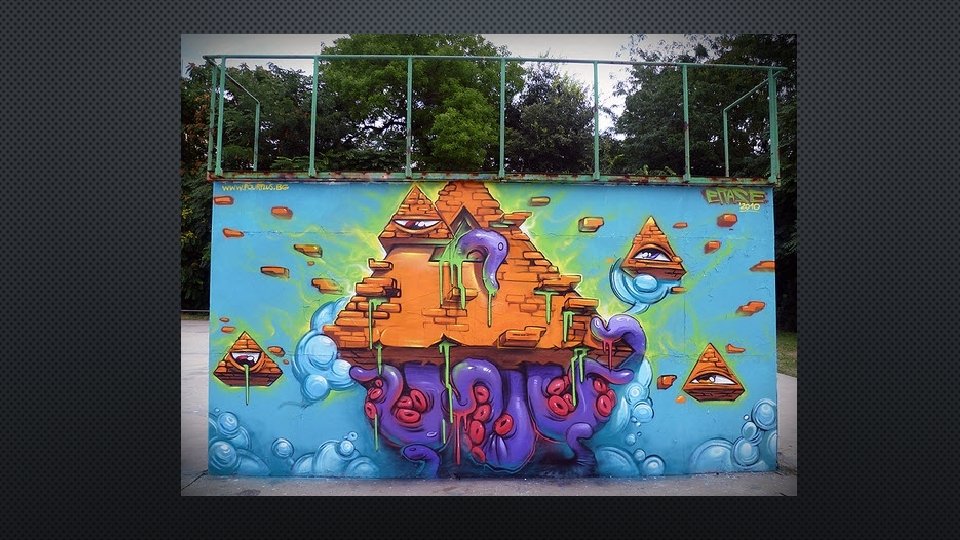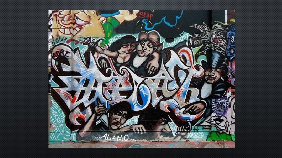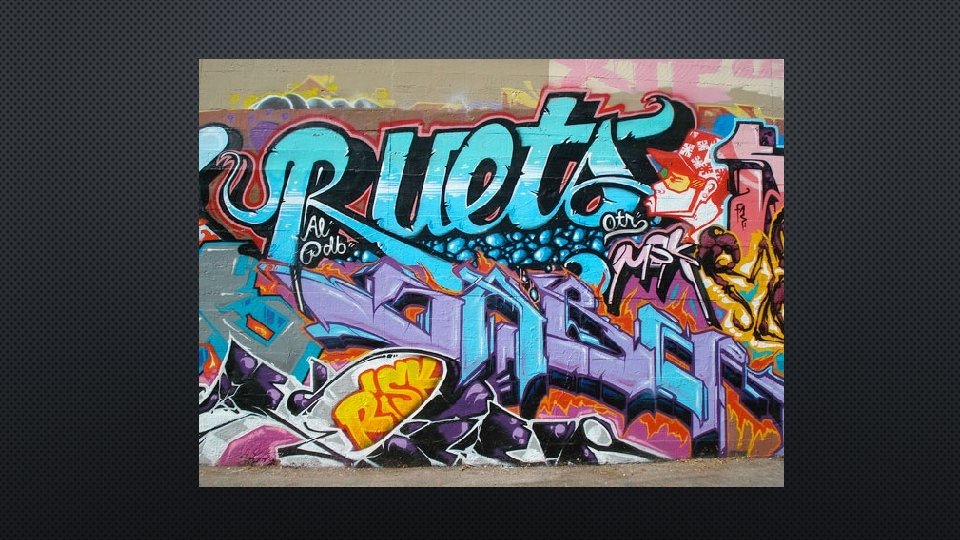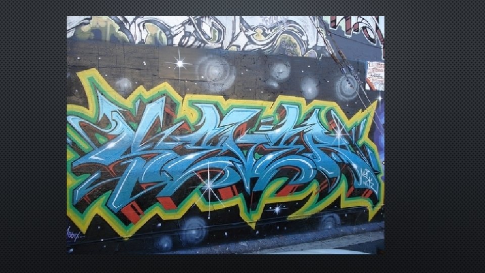 A MORE COMPLEX STYLE IS WILDSTYLE “. THIS IS A FORM OF "WILDSTYLE GRAFFITI THAT USES INTERLOCKING LETTERS AND CONNECTING POINTS. THIS STYLE IS OFTEN HARDER TO READ BY NON-GRAFFITI ARTISTS BECAUSE LETTERS MERGE INTO ONE ANOTHER IN AN OFTENUNDECIPHERABLE OR ABSTRACT MANNER.