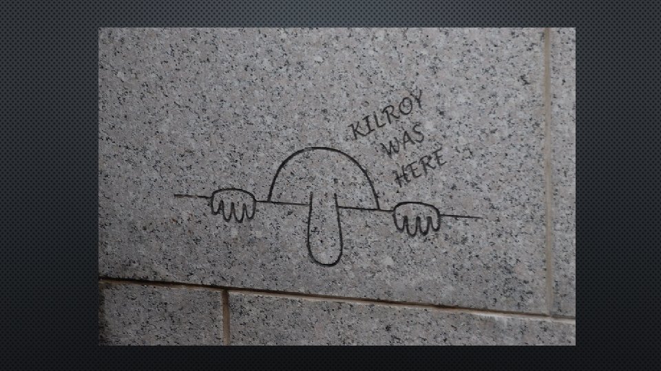 DURING WORLD WAR II AND FOR DECADES AFTER, THE PHRASE "KILROY WAS HERE" WITH AN ACCOMPANYING ILLUSTRATION WAS WIDESPREAD THROUGHOUT THE WORLD, DUE TO ITS USE BY AMERICAN TROOPS AND ULTIMATELY, FILTERING INTO AMERICAN POPULAR CULTURE.