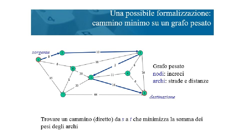 Grafo pesato Peso Un grafo pesato associa un'etichetta (peso) ad ogni suo arco. I pesi sono espressi generalmente tramite numeri reali, ma possono essere ristretti all'insieme dei razionali o degli interi. Alcuni algoritmi necessitano di maggiori restrizioni sui pesi. Ad esempio, l'algoritmo di Dijkstra funziona propriamente solo con pesi positivi. Talvolta il peso fra due vertici non connessi da un arco è indicato con il valore infinito.