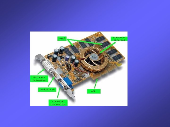 Princíp grafickej karty • kombinácia grafickej pamäte, grafického procesora a RAMDAC prevodníka • videoprocesor pravidelne číta obsah grafickej pamäte , jej obsah spracuje a vysiela ho na monitor analógovým alebo digitálnym signálom • RAMDAC prevodník zabezpečuje prevod digitálneho signálu na analógový pre staršie CRT monitory • logika zabezpečujúca nekonfliktný prístup CPU počítača a videoprocesora do grafickej pamäti