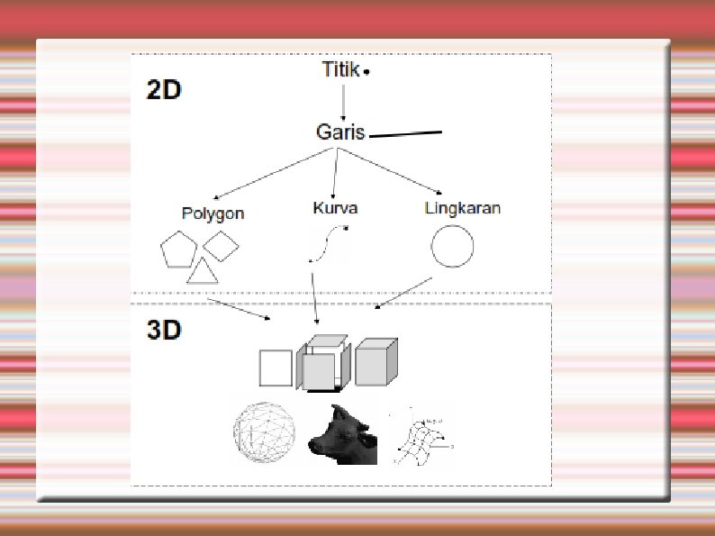 Pemodelan Geometris • Transformasi dari suatu konsep (atau suatu benda nyata) ke suatu model geometris yang bisa ditampilkan pada suatu komputer : o Shape/bentuk o Posisi o Orientasi (cara pandang) o Surface Properties / Ciri-ciri Permukaan (warna, tekstur) o Volumetric Properties / Ciri-ciri volumetric (ketebalan/pejal, penyebaran cahaya) o Lights/cahaya (tingkat terang, jenis warna) o Dan lain-lain …