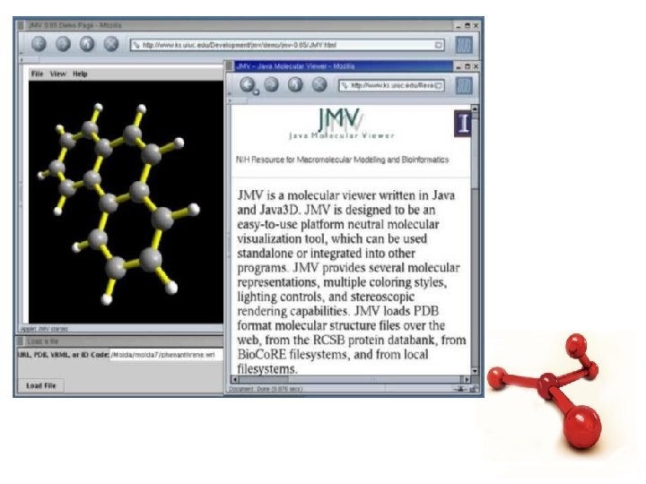 Programet për afishim • JMOL është një program i thjeshtë për të afishar në kompjuter molekulat në 3 D • Ndahet në një apo me shumë MENU APPLETE dhe një applet i vizualizimit