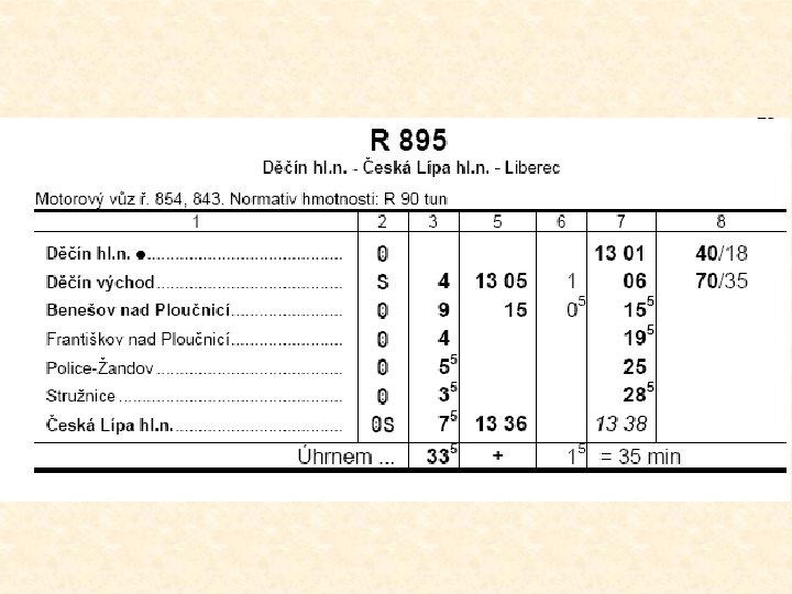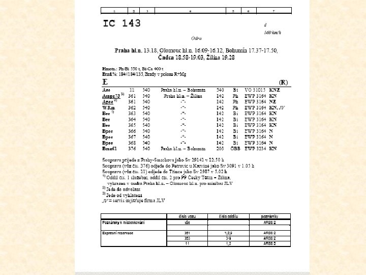 • uvádí se: • • • číslo a kategorie druh vytápění jméno trasa normativ hmotnosti omezení brzda R, R+Mg potřebné brzdicí procento místenkování propojení kabelů řazení a běh vozu