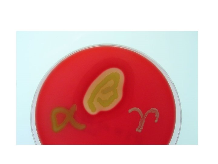 Haemolysis • Many streptococci are able to haemolyze red blood cells in-vitro in varying degrees. Complete disruption of erythrocytes with clearing of the blood around the bacterial growth is called β-haemolysis. Incomplete lysis of erythrocytes with reduction of hemoglobin and the formation of green pigment is called α-haemolysis. Other streptococci are non-hemolytic (sometimes called gamma hemolysis
