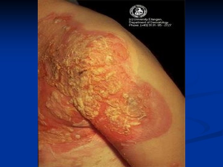 Clinical Syndromes A) Diseases of Staphylococcus aureus n Scalded skin syndrome - Abrupt onset with localized perioral erythema that spreads to cover the entire body within 2 days. - Nikolsky sign - Large bullae or cutaneous blisters form, followed by desquamation of the epithelium. - Lesions are devoid from organisms or white blood cells. - Recovery without scarring in 7 -10 days is associated with antibody production against the toxin.