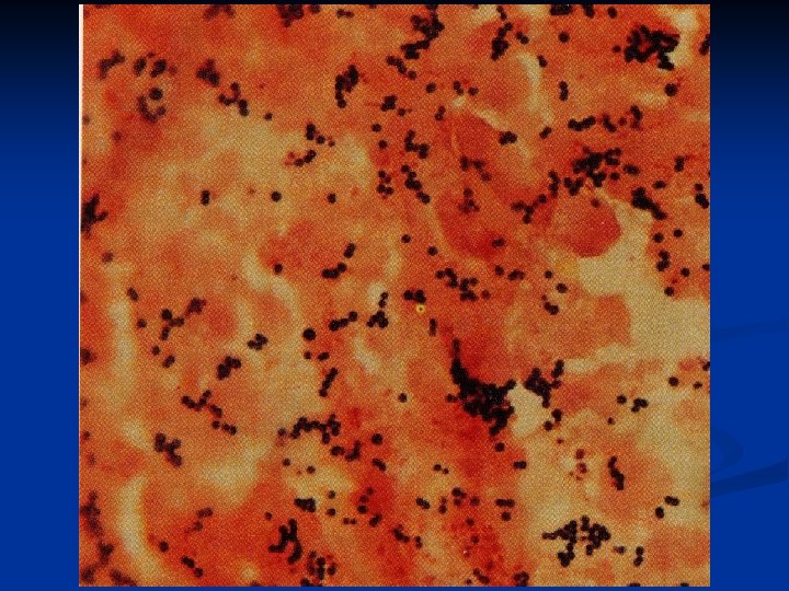 DIAGNOSIS n 1. In all pus forming lesions n Gram stain and culture of pus n 2. In all systemic infections n Blood culture n 3. In infections of other tissues n Culture of relevant tissue or exudate