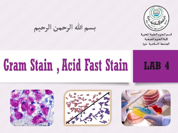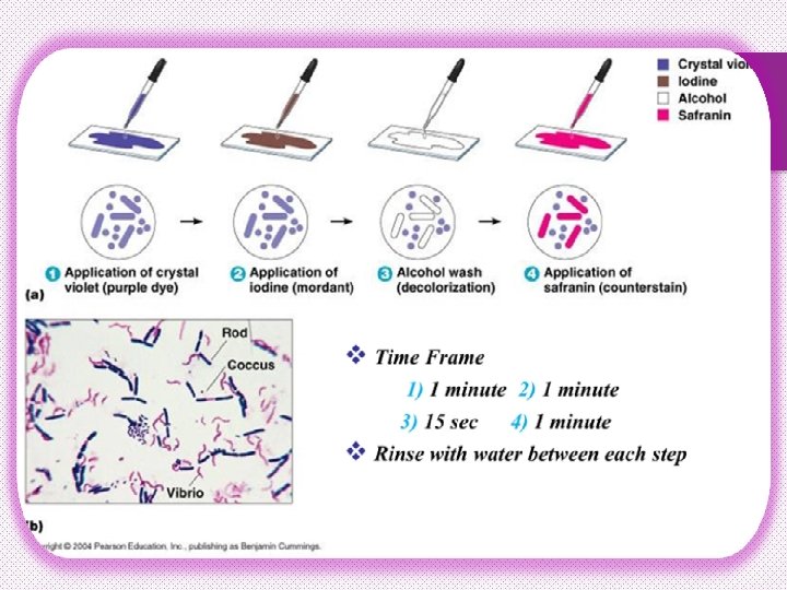 Reagents for Gram Stain v. Crystal Violet (purple). § Primary stain; positive stain § Stains cell wall purple v. Iodine § Mordant § Combines with primary stain to form an insoluble complex that gets trapped in bacterial cell wall