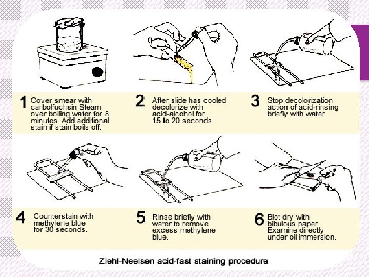 v. The reagents used are Ziehl–Neelsen carbolfuchsin, acid alcohol, and methylene blue. v Acid-fast bacilli will be bright red after staining.