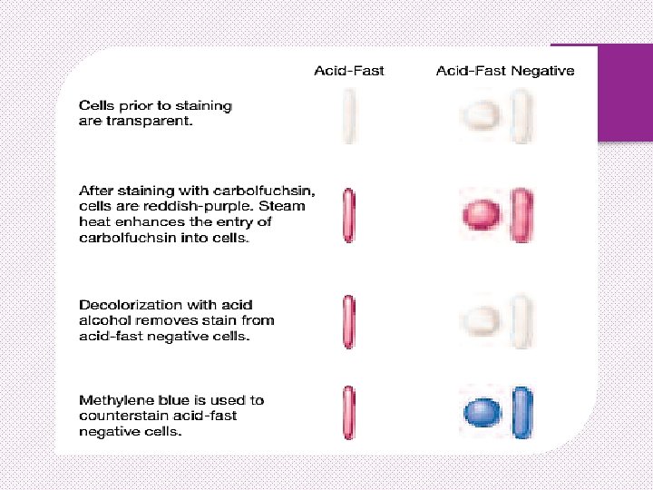 v. Since carbolfuchsin is more soluble in waxy cell lipids than in acid-alcohol, the acid-alcohol removes the carbolfuchsin from non-acid-fast organisms, but not from acid-fast organisms. Following decolorization, the sample is counterstained with methylene blue which Cannot penetrate mycolic acid; provides contrast to non acid fast cells.