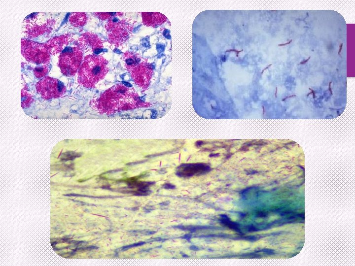 v. Acid-fast stains are useful in identification of acidfast bacilli (AFB)and rapid, preliminary diagnosis of tuberculosis (with greater than 90% predictive value from sputum samples). v It also can be performed on patient samples to track the progress of antibiotic therapy and determine their degree of contagiousness.