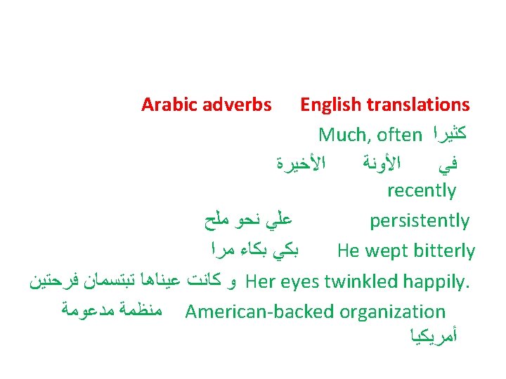 For example, the accusative suffix is a recognized means of forming adverbs in Arabic, while English adds 'ly' to form adverbs. •