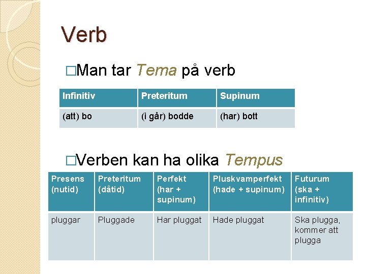 Verb �Man tar Tema på verb Infinitiv Preteritum Supinum (att) bo (i går) bodde (har) bott �Verben kan ha olika Tempus Presens Preteritum Perfekt Pluskvamperfekt (tidsformer) (nutid) (dåtid) (har + (hade + supinum) pluggar �. Pluggade Har pluggat Hade pluggat Futurum (ska + infinitiv) Ska plugga, kommer att plugga