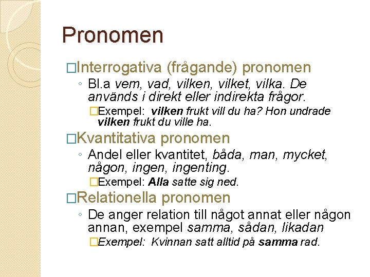 Pronomen �Interrogativa (frågande) pronomen ◦ Bl. a vem, vad, vilken, vilket, vilka. De används i direkt eller indirekta frågor. �Exempel: vilken frukt vill du ha? Hon undrade vilken frukt du ville ha. �Kvantitativa pronomen ◦ Andel eller kvantitet, båda, man, mycket, någon, ingenting. �Exempel: Alla satte sig ned. �Relationella pronomen ◦ De anger relation till något annat eller någon annan, exempel samma, sådan, likadan �Exempel: Kvinnan satt alltid på samma rad.