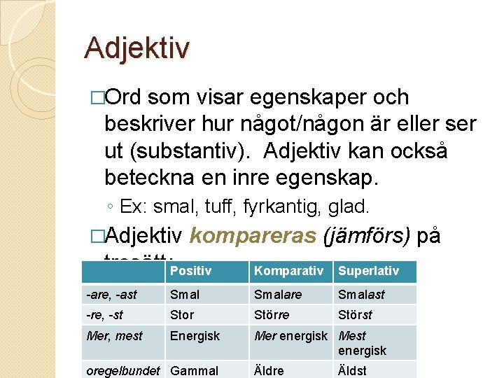 Adjektiv �Ord som visar egenskaper och beskriver hur något/någon är eller ser ut (substantiv). Adjektiv kan också beteckna en inre egenskap. ◦ Ex: smal, tuff, fyrkantig, glad. �Adjektiv kompareras (jämförs) på tresätt: Positiv Komparativ Superlativ -are, -ast Smalare Smalast -re, -st Stor Större Störst Mer, mest Energisk Mer energisk Mest energisk oregelbundet Gammal Äldre Äldst