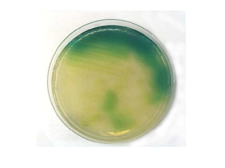Lab diagnosis • Gram negative rods • Non-lactose-fermenting (colorless) colonies on Mac. Conkey or EMB agar. • In TSI: Alkalin/Alkalin • Oxidase-positive • Blue-green pigment on nutrient agar • Fruity aroma • Catalaze and gelatinase positive