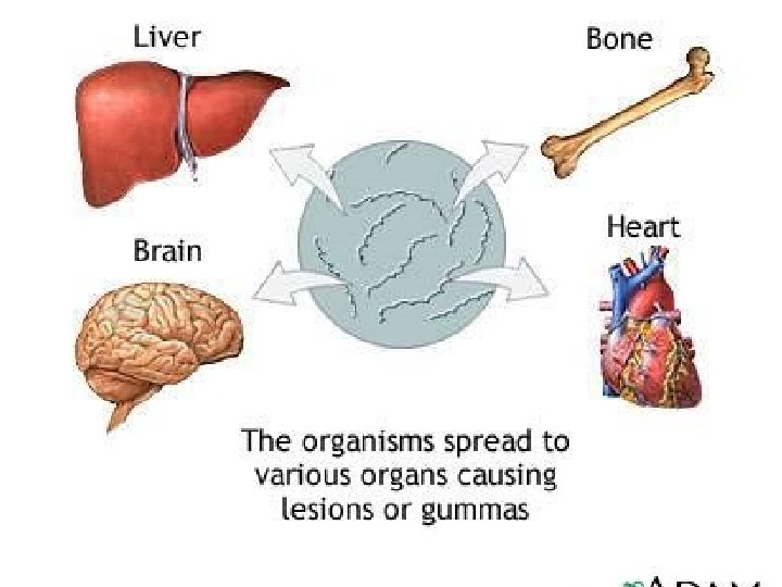 • In the remainder, the disease progresses to the late, tertiary stage. - Granulomas (gummas), especially of skin and bones, central nervous system involvement (e. g. tabes, paresis), or cardiovascular lesions (eg, aortitis, aneurysm). - In tertiary stage, the treponemes are very rare.