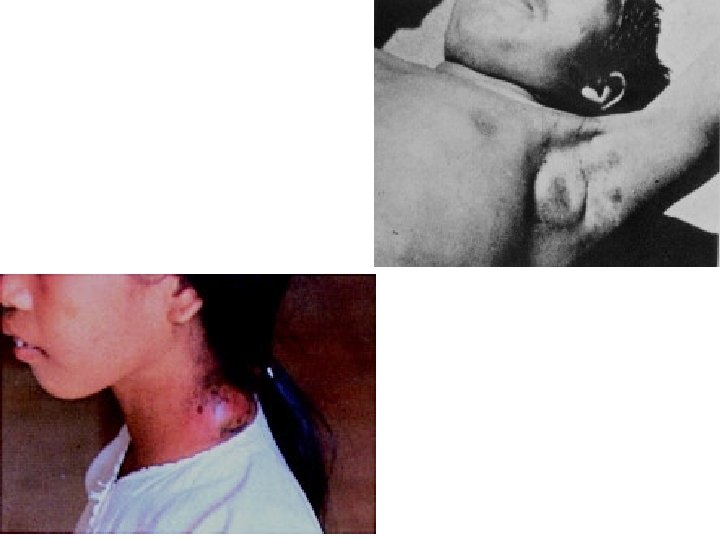 Clinical findings • Bubonic plague, is the most frequent form, begins with pain and swelling of the lymph nodes draining the site of the flea bite and systemic symptoms such as high fever, myalgias, and prostration. • The buboes are an early characteristic finding. • Septic shock and pneumonia are the main lifethreatening subsequent events.
