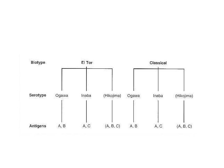 • O 1 organisms: have two biotypes (El Tor and cholerae) and 3 serotypes (Ogawa, Inaba and Hikojima)