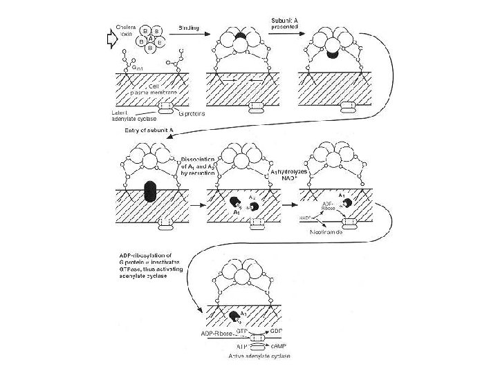 • Multiplication and secretion of enterotoxin. • Enterotoxin (Choleragen) first binds to a sialic acid-containing ganglioside receptor on the surface of the enterocyte. • Then enterotoxin catalyzes the addition of ADPribose to the coupling protein, resulting in the activation of adenylate cyclase increase in c. AMP Secretion of the secretion of H 20, Na+, K+, Cl-, and HCO 3 - into the lumen of the small intestine.